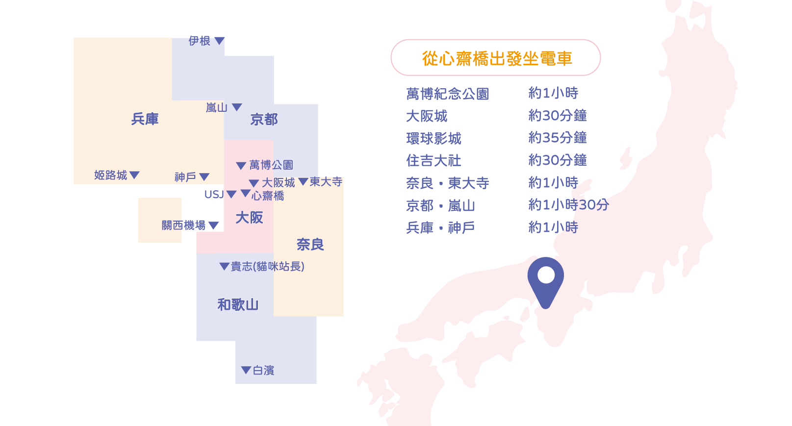 大阪有環球影城、海遊館還有可以開心購物的心齋橋、日本最長商店街等...想要前往關西的觀光勝地:京都、奈良、神戶等地車程都在一個小時左右。